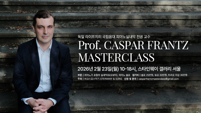 더 보기독일 라이프치히 국립음대 피아노실내악 전공 교수 스타인웨이 아티스트 카스파 프란츠 마스터클래스 Prof. Caspar Frantz MASTERCLASS 일시 | 2026년 2월 23일(월) 오전 10시 ~ 오후 6시 장소 | 스타인웨이 갤러리 서울 부문 | 피아노가 포함된 실내악(듀오부터), 피아노 솔로 참가비 | 솔로 2...
