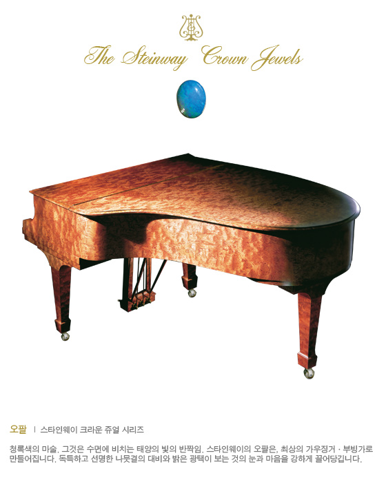 청록색의 마술. 그것은 수면에 비치는 태양의 빛의 반짝임. 스타인웨이의 오팔은, 최상의 가우징거·부빙가로 만들어집니다. 독특하고 선명한 나뭇결의 대비와 밝은 광택이 보는 것의 눈과 마음을 강하게 끌어당깁니다.