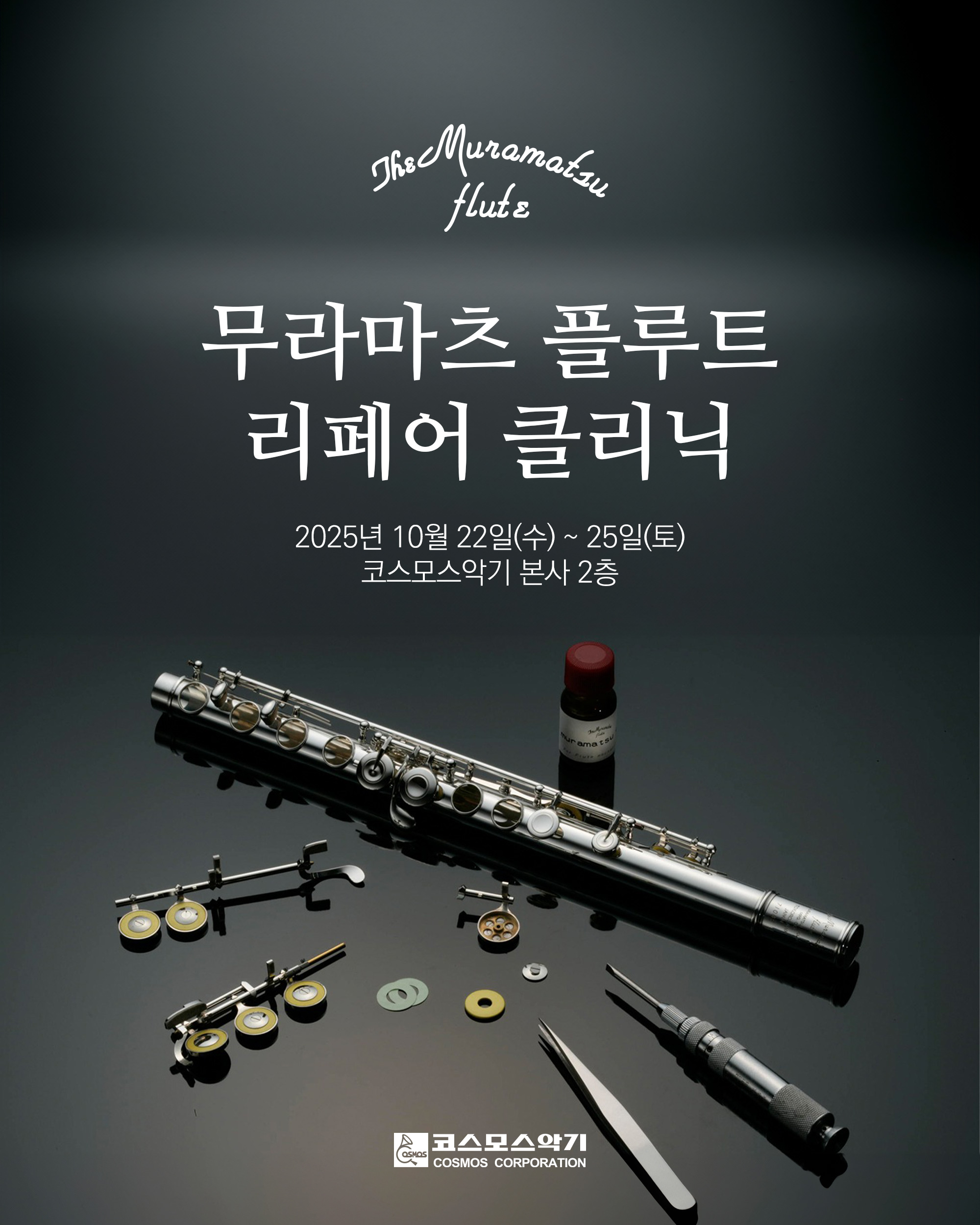 (주)코스모스악기에서는 변함없는 고객님들의 성원에 보답하고자 다음과 같이 Muramatsu Flute와 함께 Flute Repair 및 악기 전시회를 마련하였습니다.
